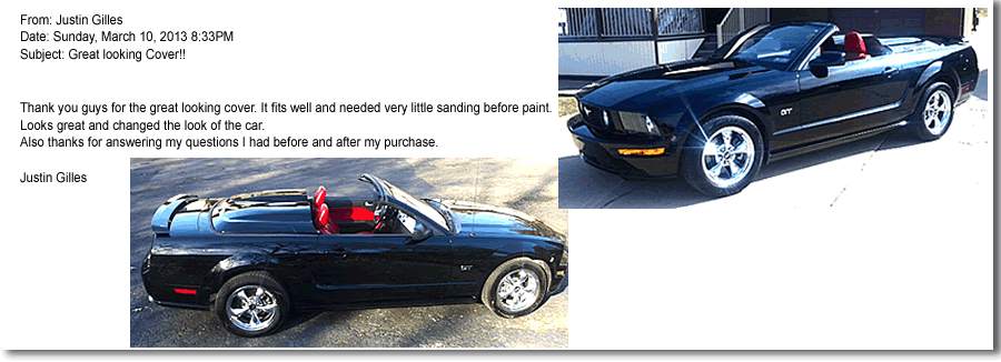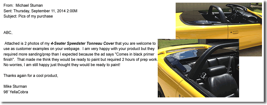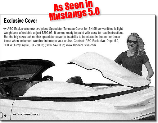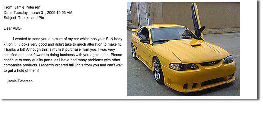 | Date: Thursday, September 22, 2000 11:32AM From: Steven R Subject: Thank you! Dear ABC Exclusive, Thank you for taking care my order so promptly! I would like you to know that your sales persons are very helpful and friendly on the phone, they were very patiented to explain the differences on the parts, (which I would have made ethe wrong order again.) I recommanded you guys to my Stang club members. By the way, my buddies love your styling bar and the speedster tonneau covers, they will be calling you! Your very pleased customer. |