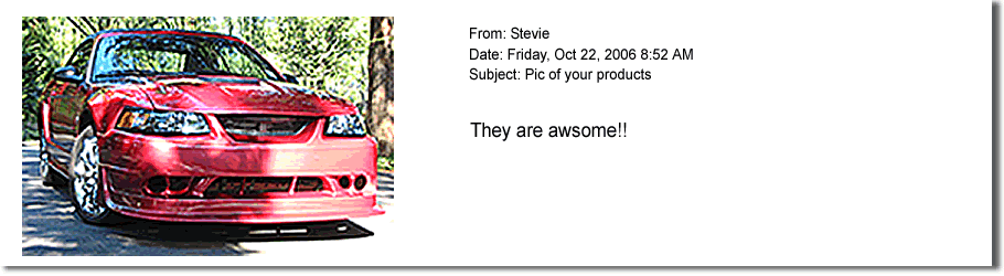 | Date: Saturday, March 11, 2000 12:22 PM From: Matt Brandt Subject: Stang Parts I don't know if you remember me or not but a while back I inquired about a 2 3/4 cowl hood and some other parts. I recently purchased them from ABC and I must say that I am more than pleased with the quality of the parts. I ordered the 2 3/4 cowl, a cobra wing and the cobra front grill for my 88 lx and all I can say is that you guys kick ass. When I brought the parts to my body man he was more than pleased with the products. You know as well as I do that body men do not like to prep wavy fiberglass. So this is a letter of appreciation to both you and your company for a job well done. When my stang returns from the body shop (painted Ford Mystic) I will send you a picture so you can see the final results. You have a customer for life and I have already recommended you guys to fellow stang owners.. Keep up the good work and thanks again! Sincerely, Matt Brandt 88 Lx |